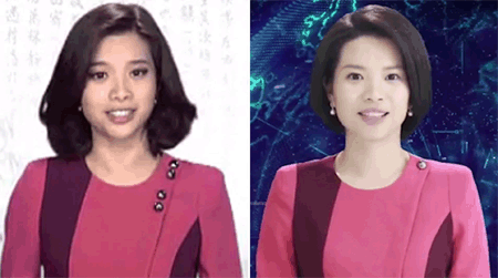 Xin Xiaomeng (right), the first female artificial intelligence news anchor, from China’s state-run press agency Xinhua. Xin Xiaomeng was modeled after flesh-and-blood journalist Qu Meng (left). To see Xin Xiaomeng at work, go here.